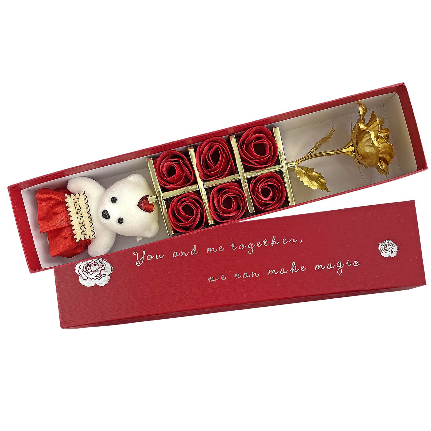 Κουτί Μακρόστενο με Αρκούδο, Τριαντάφυλλα Κόκκινα & Χρυσό 33x7x5cm