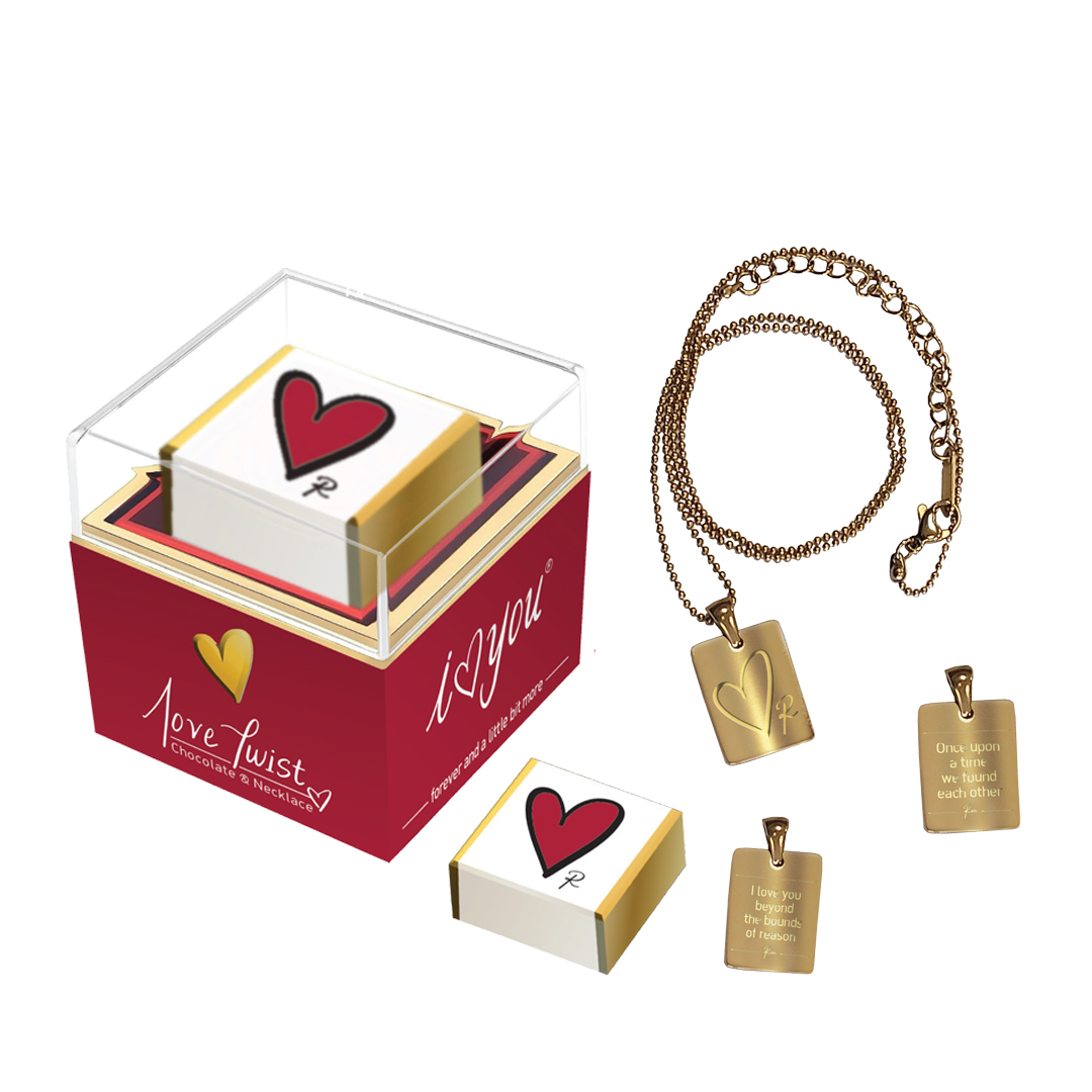 Απόλαυσε την πολυτέλεια της σοκολάτας, και ανακάλυψε ένα κομψό κολιέ με τρυφερό μήνυμα.Περιστρεφόμενο κουτί που περιλαμβάνει ένα σοκολατάκι και ένα επιχρυσωμένο κολιέ. Συστατικά: Σοκολάτα γάλακτος 40% (ζάχαρη, βούτυρο κακάο, πλήρες ΓΑΛΑ σε σκόνη, κακαόμαζα, γαλακτωματοποιητής: λεκιθίνη ΣΟΓΙΑΣ, φυσική αρωματική ύλη βανίλιας), γέμιση πραλίνας ΦΟΥΝΤΟΥΚΙΟΥ 60% (ζάχαρη, φυτικά έλαια, πάστα ΦΟΥΝΤΟΥΚΙΟΥ 13%, πλήρες ΓΑΛΑ σε σκόνη, κακάο, ορός ΓΑΛΑΚΤΟΣ, λεκιθίνη ηλίανθου, βανιλίνη). Μπορεί να περιέχει ίχνη από ΘΕΙΩΔΗ, ΓΛΟΥΤΕΝΗ, ΑΥΓΑ, ΣΟΥΣΑΜΙ, ΑΡΑΧΙΔΕΣ και ΑΛΛΟΥΣ ΞΗΡΟΥΣ ΚΑΡΠΟΥΣ. Διατροφική Δήλωση ανά 100g: Ενέργεια 2309 kJ / 552 kcal, Λιπαρά 34.1 g (κορεσμένα 16.5 g), Υδατάνθρακες 55.9 g (σάκχαρα 51.1 g), Πρωτεΐνες 5.5 g, Αλάτι 0.10 g.